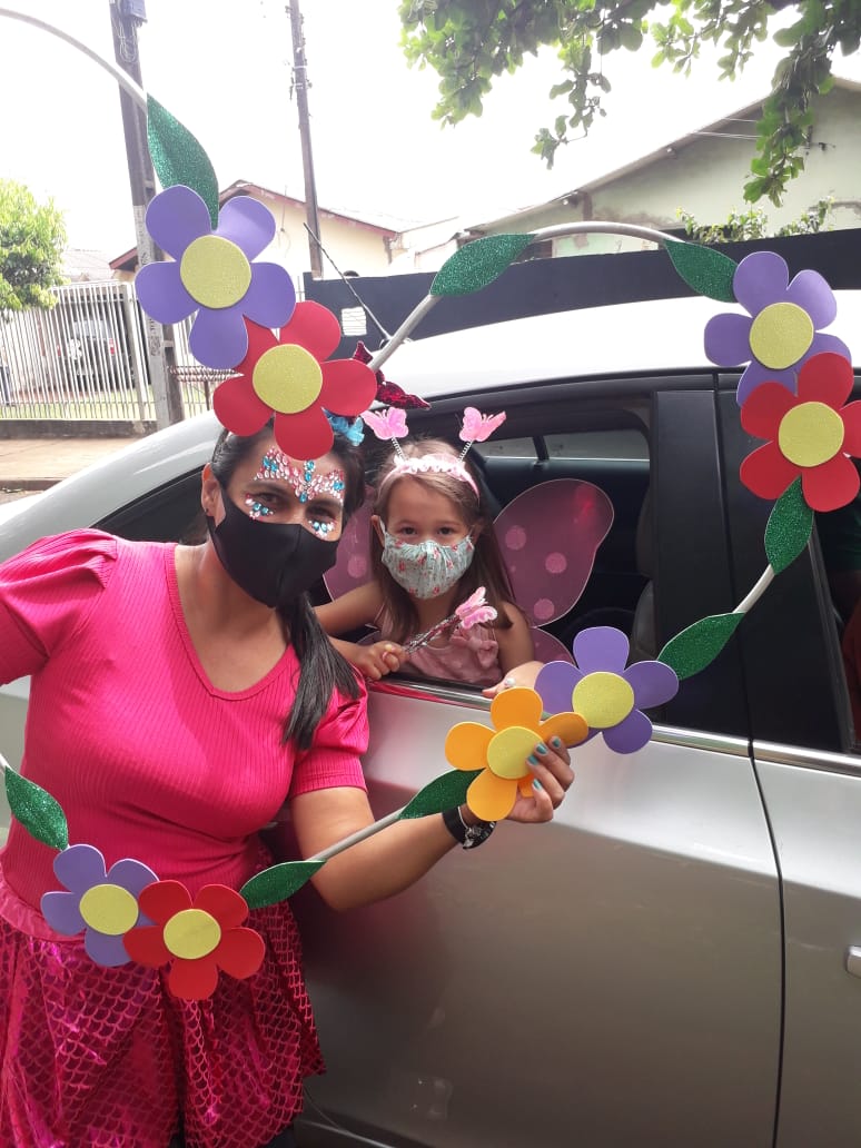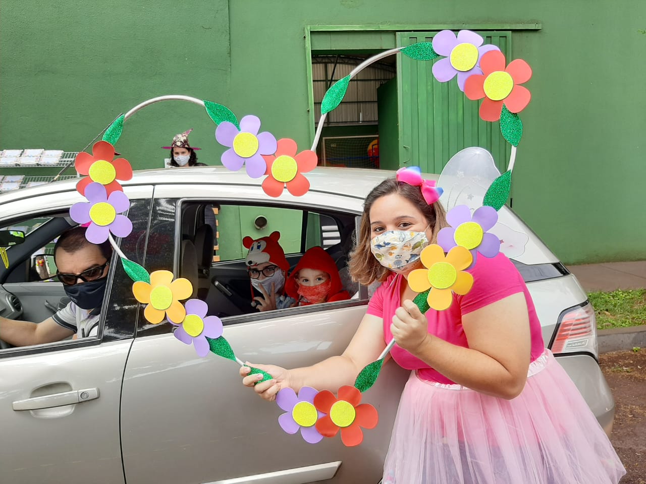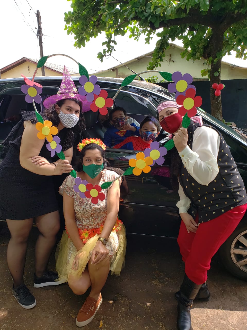 As professoras também se vestiram com um personagem e fizeram a maior festa com a passagem de suas crianças pelo percurso.